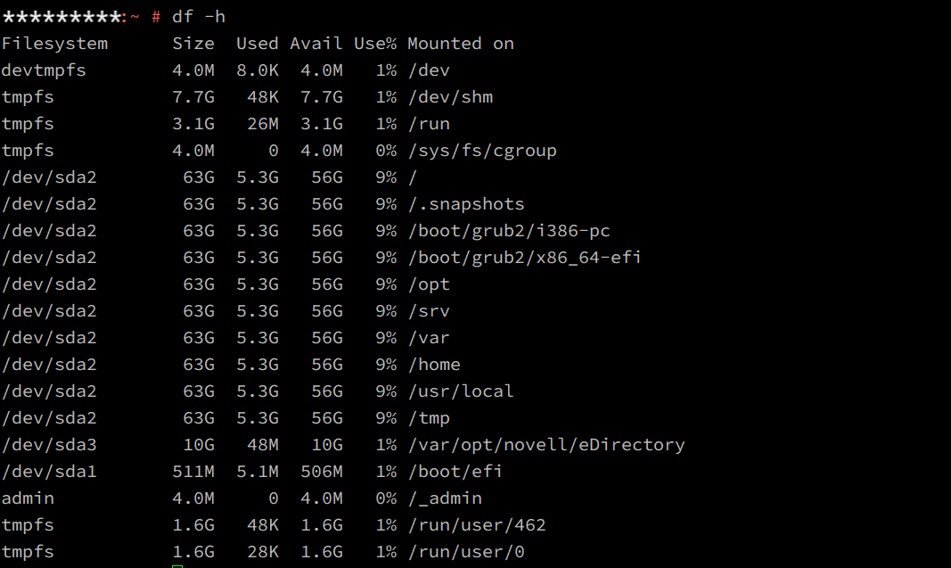 The df -h command lists the device name of the root partition. In the following example, the root partition to write down is /dev/sda2 (mounted as /).