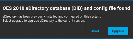 NOTE:If you are upgrading from OES 2018 SP3, this dialog will show that the OES 2018 eDirectory database (DIB) and config file were found.