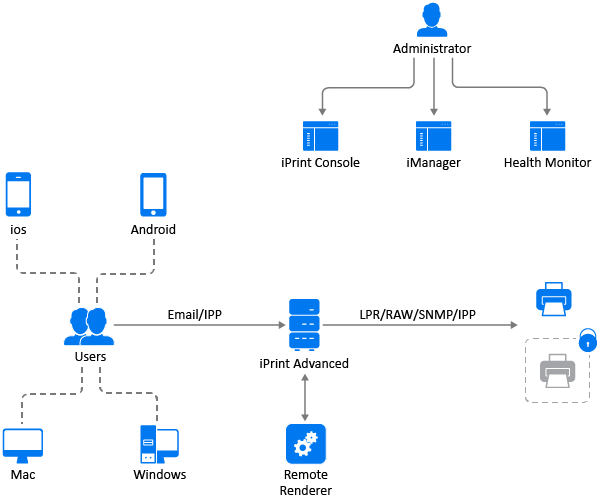 OES iPrint Advanced server also ships with a Remote Renderer. For enhanced desktop-quality printing, you should use Remote Renderer. The remote renderer can be downloaded from the iPrint Console and must be installed on a Windows 64-bit computer.