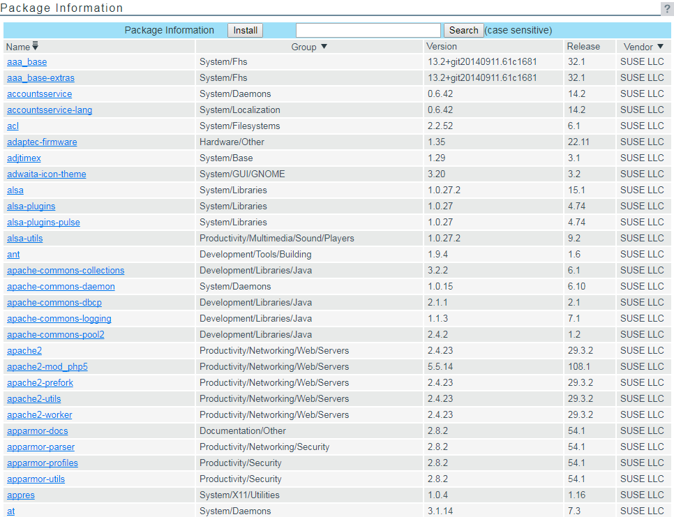Clicking the View Package Information link displays the Packing Information page. On this page you can view the following information about each package that is installed on the system: