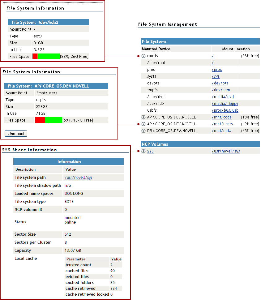 File System Information. This page shows the mount point, the file system type, the size of the mount point and the space in use. Clicking the Unmount button on this page, dismounts the remote file system shown. The Unmount button is available only on remotely mounted file systems such as NFS, NCP, and Samba.