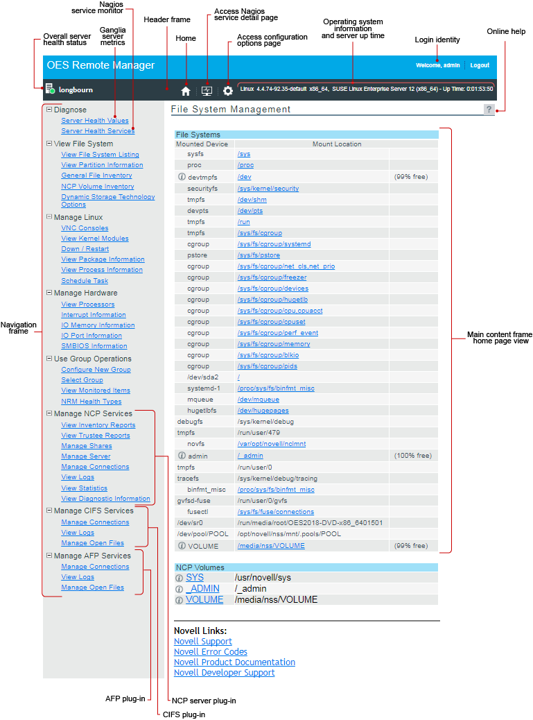 See the following sections for more information about the layout of the OES Remote Manager Home page: