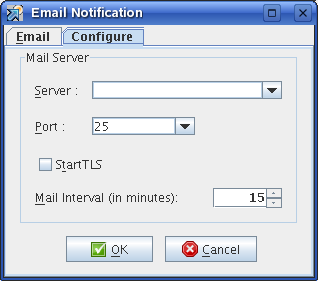 4. Specify the mail interval (in minutes) to send e-mail messages for errors encountered. The default time is 15 minutes, but you can increase or decrease the interval as necessary. The e-mail messages are sent only if error notification in the Email tab is set and if errors are encountered.