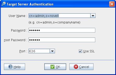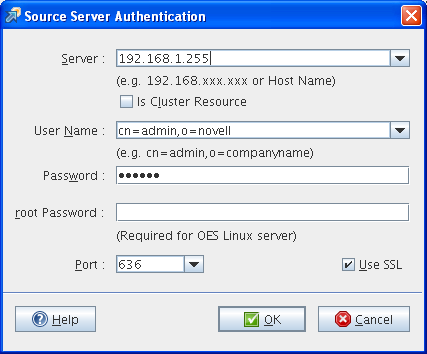 In the User Name field, specify the FDN of the admin user of the source server. Use the LDAP (comma-delimited) format. For example, cn=admin,o=novell