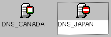 Figure 1-15 shows icons representing two DNS servers. Both servers are operational, novell-named has been loaded and each can communicate with the Java Management Console, but the operation of the server on the right (DNS_JAPAN) has been suspended.