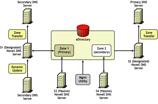 Our implementation of DNS supports the traditional primary-secondary DNS name server approach to moving DNS data in and out of eDirectory. Although all OES servers can recognize DNS data after the data is placed in the directory through eDirectory replication, only one server is required for a zone transfer. The server assigned to perform this function in a secondary zone is called the Zone-in (Designated Secondary) DNS server.