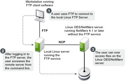 After logging in to the eDirectory tree, users can access files and directories on a remote Linux server whether or not the server is running Linux FTP Server software. The remote server can be another Linux OES server.