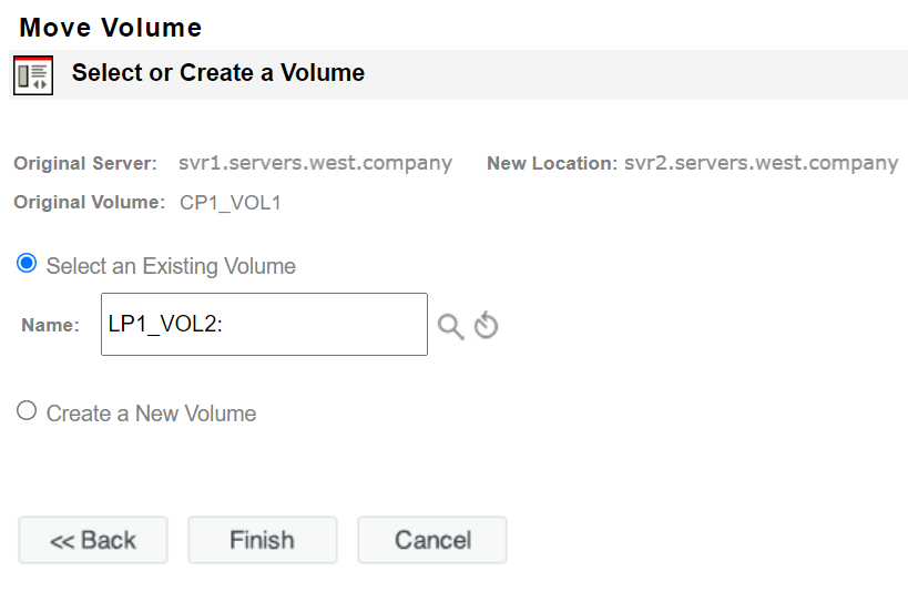 Before moving a volume, you can either select an existing volume or create a new volume as a target location to receive the source data.