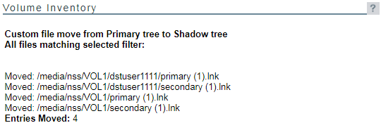 If you chose to move selected files from one volume to another, the files that meet the search criteria are automatically moved, then a confirmation list of the files and the number of entries moved is displayed.