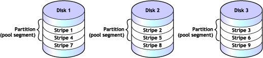 In RAID 0 and RAID 5 configurations, NSS writes data to each member device in turn. The maximum amount of data (in KB) committed to each write to a partition is called a stripe. Striping is unrelated to file block sizes that you might set on your storage device.