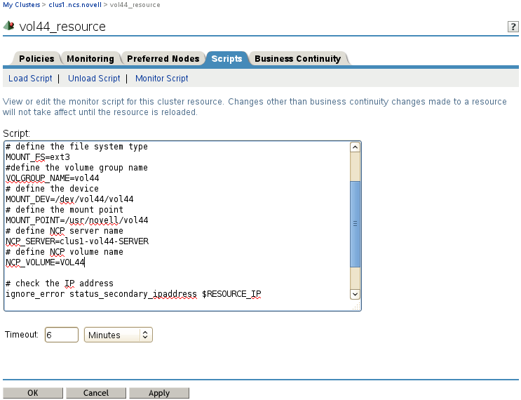 Select the cluster resource’s name link to open the Properties page, then click the Scripts tab.