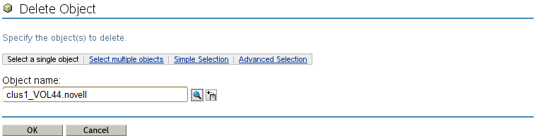 On the Delete Object page, browse to locate and select the resource’s NCP Volume object (such as clus1_VOL44.novell), then click OK.