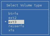 ext3 Valid values are btrfs (requires the btrfsprogs package), ext2, ext3, reiserfs, and xfs. |