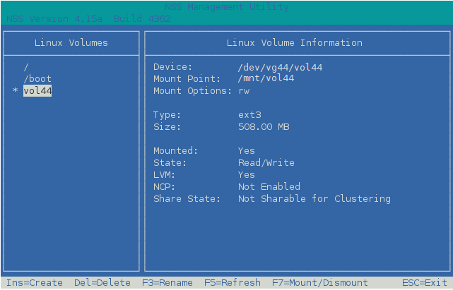 mount -t ext3 /dev/vol44/vol44 /media/ext3/vol44