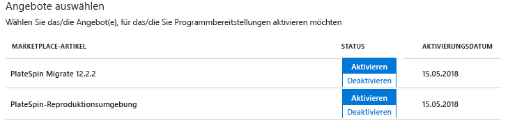 Ändern Sie für jede Azure-Subscription, die Migrationen mit PlateSpin durchführt, unter Angebote auswählen den Status der Reproduktionsumgebung von Deaktivieren zu Aktivieren.