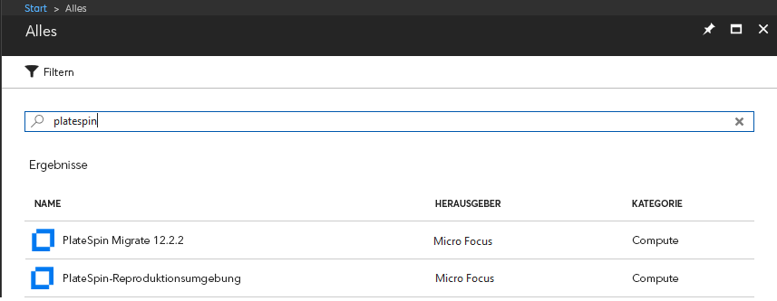 Klicken Sie im Portalmenü auf Neu und durchsuchen Sie Azure Marketplace nach PlateSpin-Images. Geben Sie platespin im Filter „Alles“ ein.
