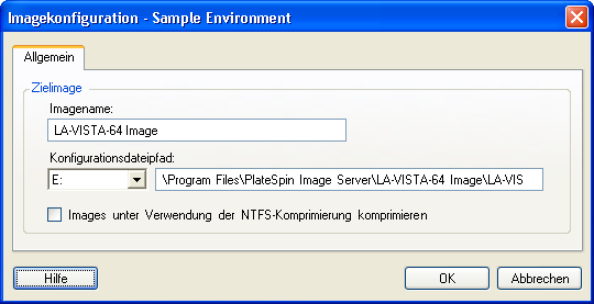 Imagekonfiguration: Geben Sie den Imagenamen und den Pfad zu dem Speicherort ein, an dem das Image gespeichert werden soll und geben Sie an, ob die NTFS-Komprimierung verwendet werden soll (klicken Sie hierzu unter „Image-Konfiguration“ auf Allgemein).