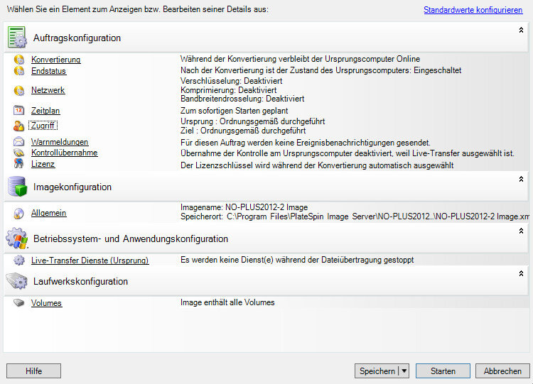 Geben Sie die erforderlichen Einstellungen für den Migrationsauftrag ein, indem Sie auf die Links in jeder Kategorie klicken: