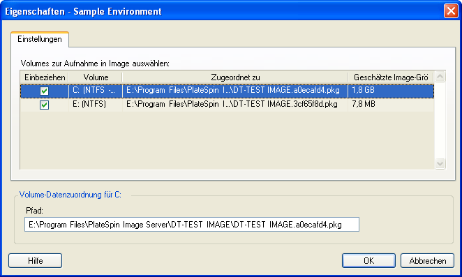 Laufwerkskonfiguration: Wählen Sie die Volumes aus, die PlateSpin Migrate in das Image aufnehmen soll und geben Sie den Pfad der Paketdatei an (klicken Sie hierzu unter „Laufwerkskonfiguration“ auf Volumes).