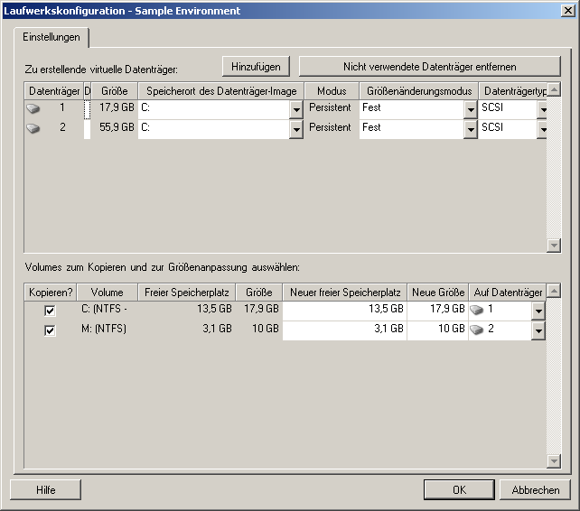Geben Sie die zu migrierenden Laufwerks- und Volume-Konfigurationen an. |