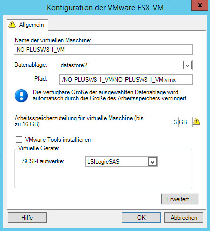 Name der virtuellen Maschine: Geben Sie den Anzeigenamen der neuen virtuellen Maschine ein. Datenablage: Wählen Sie die Datenablage aus, in der Sie die *.vmx-Datei erstellen möchten. Konfigurationsdateipfad: Geben Sie einen Namen und den Verzeichnispfad für die *.vmx-Konfigurationsdatei der virtuellen Maschine an. Arbeitsspeicherzuteilung für virtuelle Maschine: Geben Sie einen Wert für die Menge an virtuellem Arbeitsspeicher an, die der virtuellen Maschine zugewiesen werden soll. VMware Tools installieren: Aktivieren Sie diese Option, um VMware Tools während des Migrationsvorgangs zu installieren (empfohlen). SCSI-Laufwerke: Wählen Sie BusLogic oder LSIlogic (die empfohlene Option). Erweitert: Klicken Sie auf diese Schaltfläche, um die erweiterten VM-Konfigurationseinstellungen anzuzeigen oder zu ändern. |