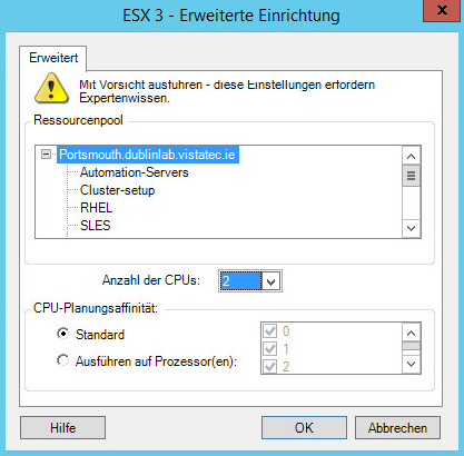 Folgende Konfigurationsoptionen sind spezifisch für VMware ESX-Systeme vor vSphere 5. Klicken Sie auf Erweitert, um auf die Einstellungen zuzugreifen, die die Ressourcenpools, die CPU-Anzahl und die CPU-Planungsaffinität steuern.