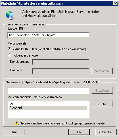 Geben Sie die erforderliche PlateSpin-Server-URL, den Benutzer und das Netzwerk ein: