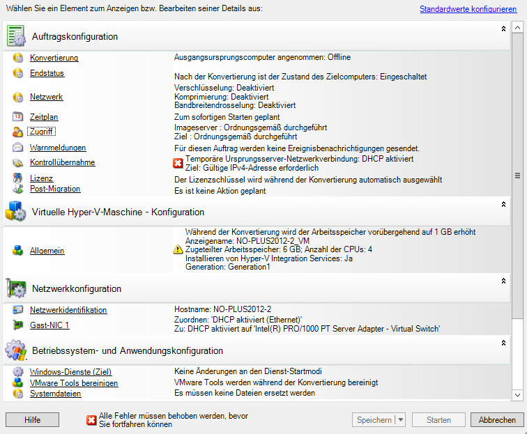 Migrationsaufträge werden automatisch so konfiguriert, dass sie den Zielcomputer mit denselben Einstellungen wie denen des Ursprungsservers erstellen. Je nach Zweck der Migration haben Sie folgende Möglichkeiten: