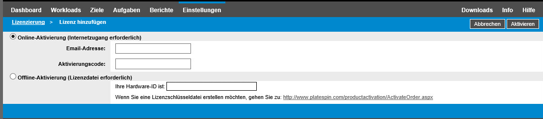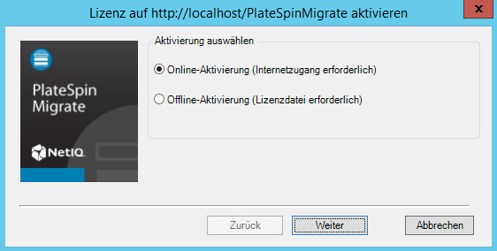 Für die Online-Aktivierung muss die PlateSpin Migrate-Weboberfläche auf das Internet zugreifen können.