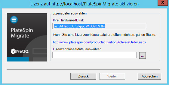 Zur Offline-Aktivierung müssen Sie zunächst den PlateSpin Migrate-Lizenzschlüssel über einen Computer mit Internetzugriff abrufen.