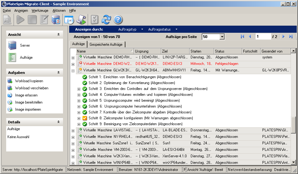 Ansicht „Aufträge“: Die Ansicht „Aufträge“ zeigt alle Aufträge an, beispielsweise Ermittlungs-, Migrations- und Image-Erfassungsaufträge. Weitere Informationen hierzu finden Sie unter Abschnitt 3.2.3, Ansicht „Aufträge“.