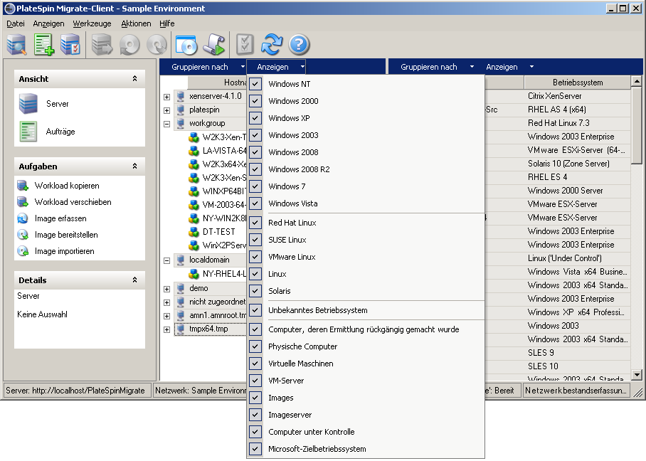 Zur weiteren Kontrolle des Umfangs der in einem der Teilfenster der Ansicht gezeigten Elemente können Sie auch das Dropdown-Menü Anzeigen verwenden, um die Computer nach Workload-Typ zu filtern; z. B. Windows Server 2008 R2, Red Hat Linux usw., wie in der folgenden Abbildung gezeigt: