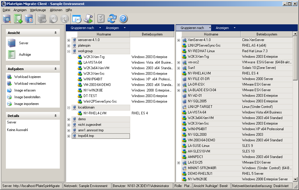Statuszeile: Die Statuszeile am unteren Rand des PlateSpin Migrate-Client-Fensters zeigt eine Reihe von Informationen an: den PlateSpin-Server, mit dem der Client gerade verbunden ist, das PlateSpin Migrate-Netzwerk, mit dem Sie zurzeit arbeiten, den Namen und die Rolle des aktuell angemeldeten Benutzers sowie den Status der automatischen Netzwerkbestandserfassungsfunktion. Weitere Informationen hierzu finden Sie unter Abschnitt 3.2.5, Statusleiste.