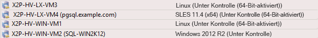 Abbildung 3-2 zeigt ein Beispiel für X2P-Hostnamen für Ziel-Workloads mit und ohne Betriebssystem. Bei den Workloads X2P-HV-LX-VM3 und X2P-HV-WIN-VM1 ist kein Betriebssystem vorhanden. Die LRD-Informationen werden als Betriebssystem angezeigt.