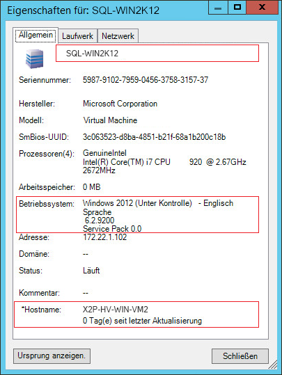 Die Eigenschaften einer virtuellen Maschine bieten Informationen zur Umgebung des Computers auf der zugehörigen Virtualisierungsplattform, einschließlich Informationen zum Host, zur Menge des zugeteilten Arbeitsspeichers und zur Rechenleistung.