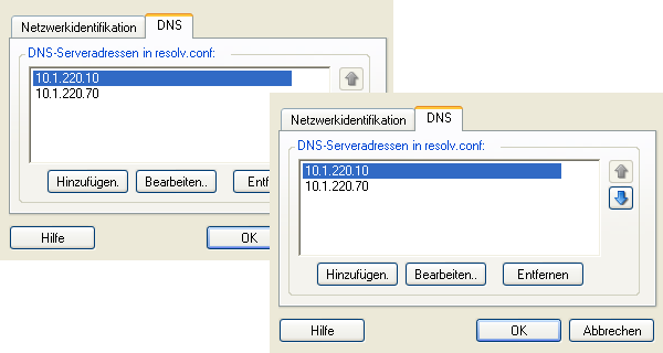 Registerkarte Netzwerkidentifikation: Geben Sie den gewünschten Hostnamen für den Zielserver ein. Registerkarte DNS: Verwenden Sie die Schaltflächen Hinzufügen, Bearbeiten und Entfernen zum Verwalten der DNS-Server-Einträge für die neue virtuelle Maschine. |