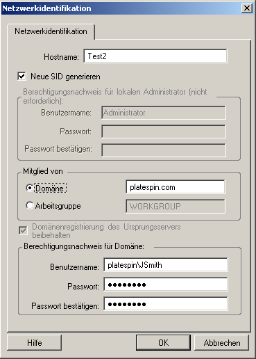 Hostname: Geben Sie den gewünschten Hostnamen für den Zielcomputer ein. Neue SID generieren: Wenn Sie diese Option auswählen, wird dem Ziel-Workload eine neuer Systembezeichner (SID) zugeordnet. Ein Berechtigungsnachweis ist nur unter Windows 2008 erforderlich. Sie benötigen auf diesen Systemen den Berechtigungsnachweis für das lokale (eingebettete) Administratorkonto. Wenn dieses Konto auf dem Ursprungscomputer lokal umbenannt wurde, müssen Sie den neuen Namen angeben. Mitglied von (Domäne/Arbeitsgruppe): Wählen Sie die erforderliche Option aus und geben Sie den Namen der Domäne oder Arbeitsgruppe ein, denen der Zielcomputer beitreten soll. Domänenregistrierung des Ursprungsservers beibehalten: Behält die Domänenregistrierung bei und stellt sicher, dass die Ursprungsserver-Domänenregistrierung während der Migration erhalten bleibt. Wenn Sie diese Option deaktivieren, wird das Domänenkonto des Ursprungscomputers auf den Zielcomputer übertragen. Der Ursprungsserver scheint sich immer noch in der Domäne zu befinden, hat jedoch keine gültige Verbindung. Domänen-Berechtigungsnachweis: Wenn der Zielcomputer als Teil einer Domäne vorgesehen ist, geben Sie den entsprechenden Berechtigungsnachweis für ein Benutzerkonto mit der Berechtigung zum Einfügen von Servern in die Domäne an, z. B. für ein Mitglied der Gruppe der Domänen- oder Unternehmens-Administratoren. |