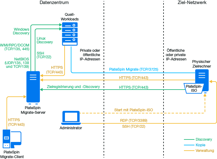 HINWEIS:Abbildung 18-1 zeigt die automatisierte Ermittlung und die Netzwerkanforderungen für Windows- und Linux-Workloads. Alternativ können Sie den Workload mit dem Migrate Agent auf dem Ursprungs-Workload registrieren und seine Inventardetails per HTTPS (TCP/443) an den PlateSpin Migrate-Server senden. Weitere Informationen hierzu finden Sie unter Abschnitt 2.6.2, Voraussetzungen für die Workload-Registrierung und Abschnitt 22.7, Registrieren von Workloads und Ermitteln der Details im Migrate Agent.