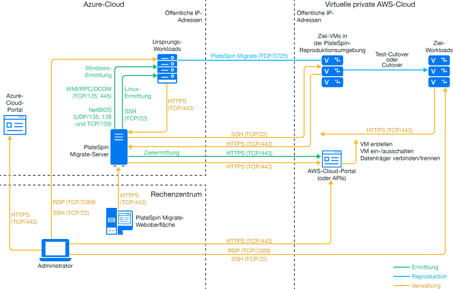 HINWEIS:Abbildung 12-5 zeigt Ursprungs-Workloads und den Migrate-Server in derselben Netzwerksicherheitsgruppe. Falls sie sich in unterschiedlichen Sicherheitsgruppen befinden, verwenden Sie Migrate Agent auf dem Ursprungs-Workload, um den Workload zu registrieren und seine Inventardetails per HTTPS (TCP/443) an den PlateSpin Migrate-Server zu senden. Weitere Informationen hierzu finden Sie unter Abschnitt 2.6.2, Voraussetzungen für die Workload-Registrierung und Abschnitt 22.7, Registrieren von Workloads und Ermitteln der Details im Migrate Agent.