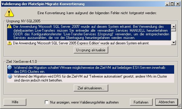 Beim Starten eines Migrationsauftrags im PlateSpin Migrate-Client überprüft PlateSpin Migrate den Auftragstyp, den Ursprung, das Ziel und die ausgewählten Parameter und gibt dabei möglicherweise Fehler- und Warnmeldungen aus.