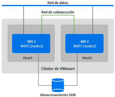 NOTA:la información de esta sección está dirigida a administradores de sistemas que estén familiarizados con la tecnología de virtualización de VMware y la tecnología de clúster de conmutación por error de Microsoft Windows Server. Consulte la documentación de Microsoft y la de VMware para obtener la información más reciente sobre los requisitos de asistencia técnica y configuración de los proveedores para el alojamiento de nodos de WSFC como máquinas virtuales en distintos hosts de virtualización de VMware.