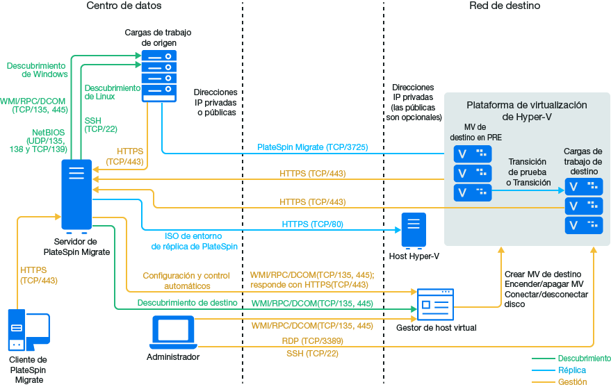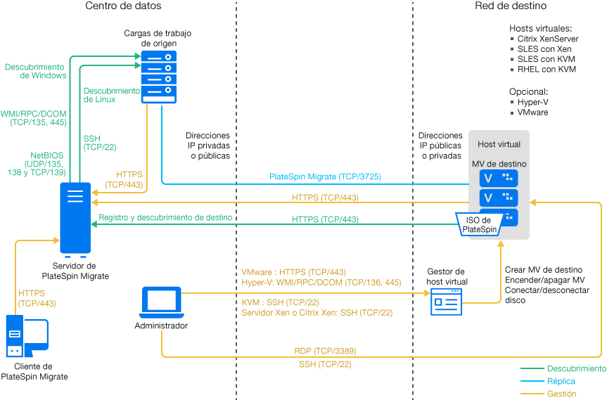 NOTA:la Figura 14-1 y la Figura 14-2 muestran los requisitos para el descubrimiento automatizado y la red para las cargas de trabajo Windows y Linux. Opcionalmente, puede usar el agente de Migrate en la carga de trabajo de origen para registrar la carga de trabajo y enviar sus datos de inventario al servidor de PlateSpin Migrate mediante HTTPS (TCP/443). Consulte Sección 2.6.2, Requisitos para el registro de la carga de trabajo y Sección 22.7, Registro de cargas de trabajo y descubrimiento de detalles con el agente de Mígrate.
