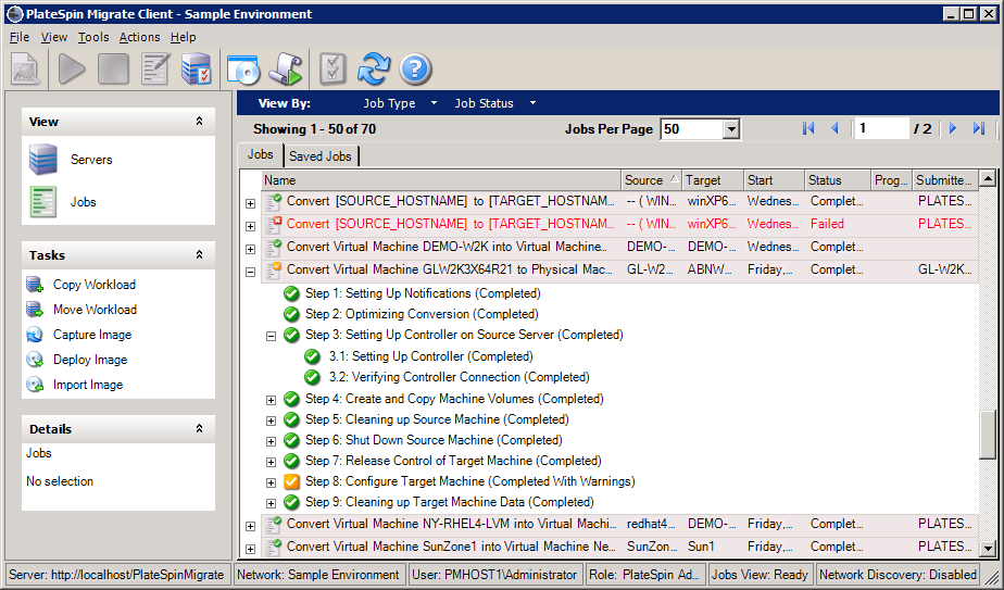 Figura 3-6 Vista Jobs (Trabajos) del cliente de PlateSpin Migrate