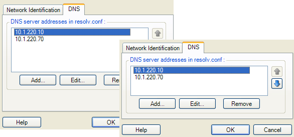 Pestaña Network Identification (Identificación de red): especifique el nombre de host que desee para el servidor de destino. Pestaña DNS: use los botones Add (Añadir), Edit (Editar) y Remove (Eliminar) para gestionar las entradas del servidor DNS para la nueva máquina virtual. |