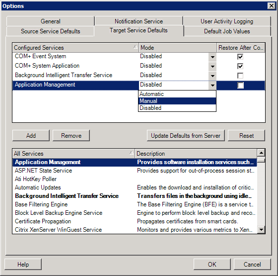 El cliente de PlateSpin Migrate permite seleccionar los servicios de Windows cuyo modo deba ser distinto en el destino respecto al origen. Consulte Estados de servicio en cargas de trabajo Windows de destino.