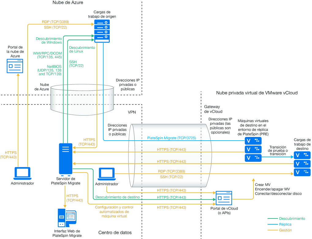 PlateSpin Migrate admite la migración de cargas de trabajo desde Microsoft Azure a VMware vCloud Director.
