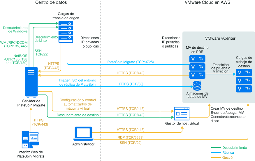NOTA:la Figura 13-1 muestra el descubrimiento automatizado y los requisitos de red de las cargas de trabajo Windows y Linux. Opcionalmente, puede usar el agente de Migrate en la carga de trabajo de origen para registrar la carga de trabajo y enviar sus datos de inventario al servidor de PlateSpin Migrate mediante HTTPS (TCP/443). Para consultar los requisitos de red al utilizar el agente de Migrate, consulte la Sección 2.6.2, Requisitos para el registro de la carga de trabajo y la Sección 22.7, Registro de cargas de trabajo y descubrimiento de detalles con el agente de Mígrate.