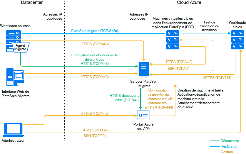 Vous pouvez déployer un serveur PlateSpin Migrate sur site dans votre datacenter avec les workloads sources ou dans l'environnement Microsoft Azure Cloud approprié : Azure global ou Azure Chine souverain.