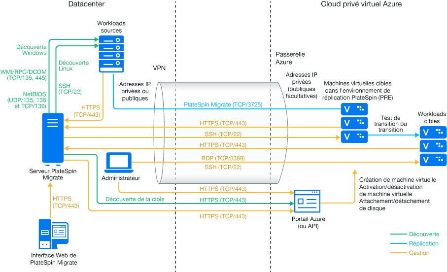 REMARQUE :la Figure 9-1 représente une découverte automatisée et les exigences réseau pour les workloads Windows et Linux. Vous pouvez également utiliser l'agent Migrate sur le workload source pour enregistrer le workload et envoyer les détails de son inventaire au serveur PlateSpin Migrate à l'aide de HTTPS (TCP/443). Reportez-vous aux sections Section 2.6.2, Conditions requises pour l'enregistrement de workloads et Section 22.7, Enregistrement de workloads et de découverte des détails avec l'agent Migrate.