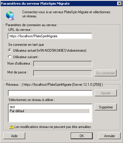 Spécifiez vos informations d'identification de connexion, l'instance du serveur PlateSpin et le réseau PlateSpin requis dans les paramètres du serveur PlateSpin Migrate.